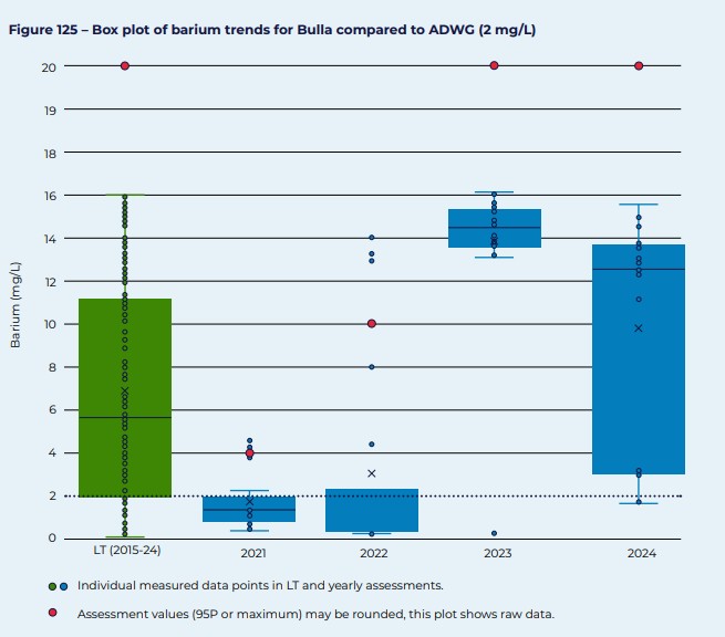 Source: Power and Water Annual Drinking Water Quality Report 2024 p114. Note that Barium levels over 2023/2024 remained exceedingly high. Approximately 14% of Barium detections at Bulla between 2015-2024 have come in under the guideline level. Only one sample per year in 2022, 2023 and 2024 have come in under the guideline level.