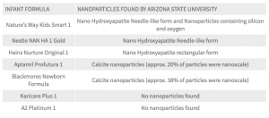 Two of these samples, Nestlé NAN H.A. Gold 1 and Nature’s Way Kids Smart 1, were found to contain a needle like form of hydroxyapatite. The European Commission’s Scientific Committee on Consumer Safety (SCCS) has concluded that this form of nano-hydroxyapatite should not be permitted in oral products such as toothpaste and mouthwash because of its potential toxicity.